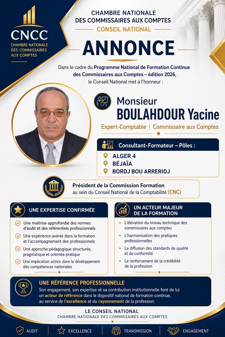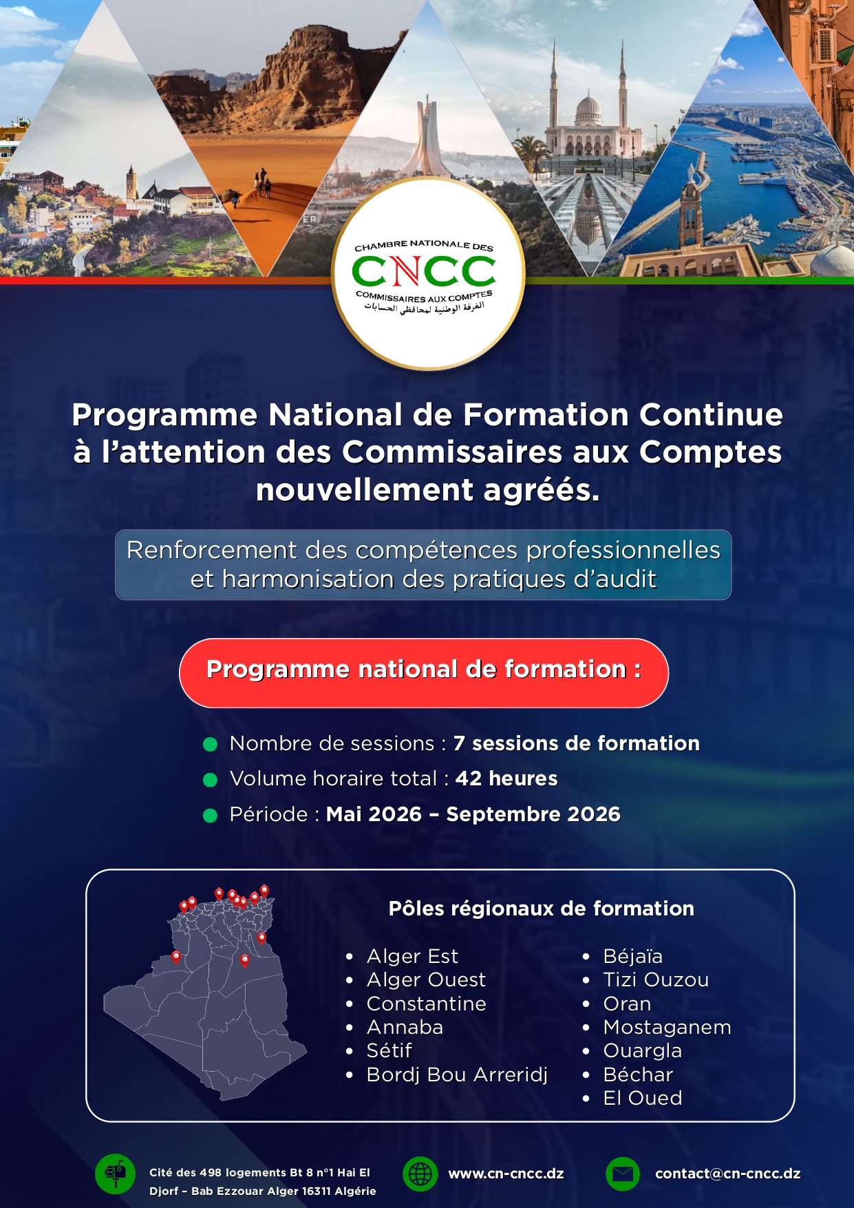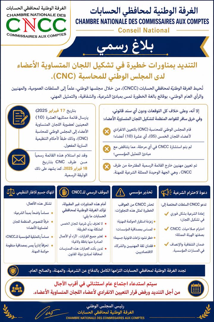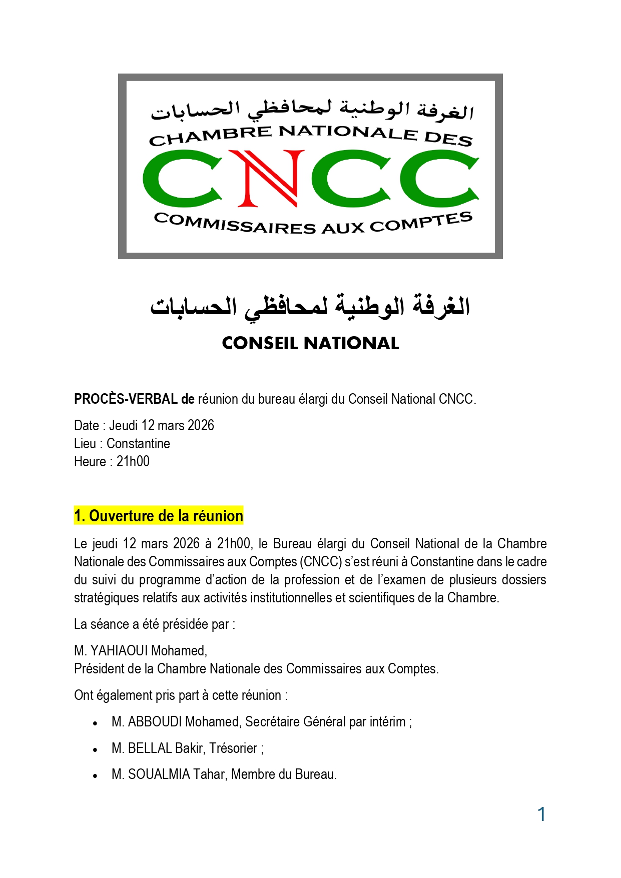 في إطار التزامها بتحديث الإطار التشريعي والتنظيمي للمهنة، نظمت الغرفة الوطنية لمحافظي الحسابات، اليوم، بفندق ماركور ، جلسة تنصيب رسمي لأعضاء فريق العمل المكلف بمراجعة قانون مهنة المحاسبة و التدقيق ، وذلك بحضور نخبة من الخبراء والمهنيين والأساتذة الجامعيين وقد قرر المجلس الوطني للغرفة تعيين السادة والسيدات التالية أسماؤهم لتشكيل هذا الفريق الاستراتيجي 1. السيد يحيـاوي محمد 2. السيد عبـودي محمد 3. السيد بلال بكير 4. السيد ناقة ساسي 5. السيدة رجيمي آسيا 6. السيد بورنان شريف 7. السيد بدالة سعيد 8. السيد ولد طالب صغير 9. السيدة موزاي وسيلة 10. السيد لبيهي مقداد 11. الأستاذ نصر الدين لزّار (محامٍ) 12. الدكتور ميزاني نور الدين (جامعة سكيكدة) 13. السيد جنّان رشيد 14. الدكتور رماح كامل 15. الدكتور قيرة عمر (جامعة جيجل) 16. الأستاذ حمران محمد (المدرسة الوطنية العليا للتسيير) 17. الدكتور بلال عبد الحليم (جامعة سكيكدة) 18. الدكتور ڨريتلي محمد (جامعة البليدة 2 – العفرون) 19. السيدة بوخروبة دنيا 20. السيد دغي مهدي 21. السيد صياد كريم وتأتي هذه المبادرة في إطار الجهود الرامية إلى تطوير قانون المهنة ، بما يتماشى مع التحولات الاقتصادية والالتزامات الدولية للجزائر، وبما يعزز من مكانة محافظ الحسابات كفاعل أساسي في الحوكمة والشفافية المالية