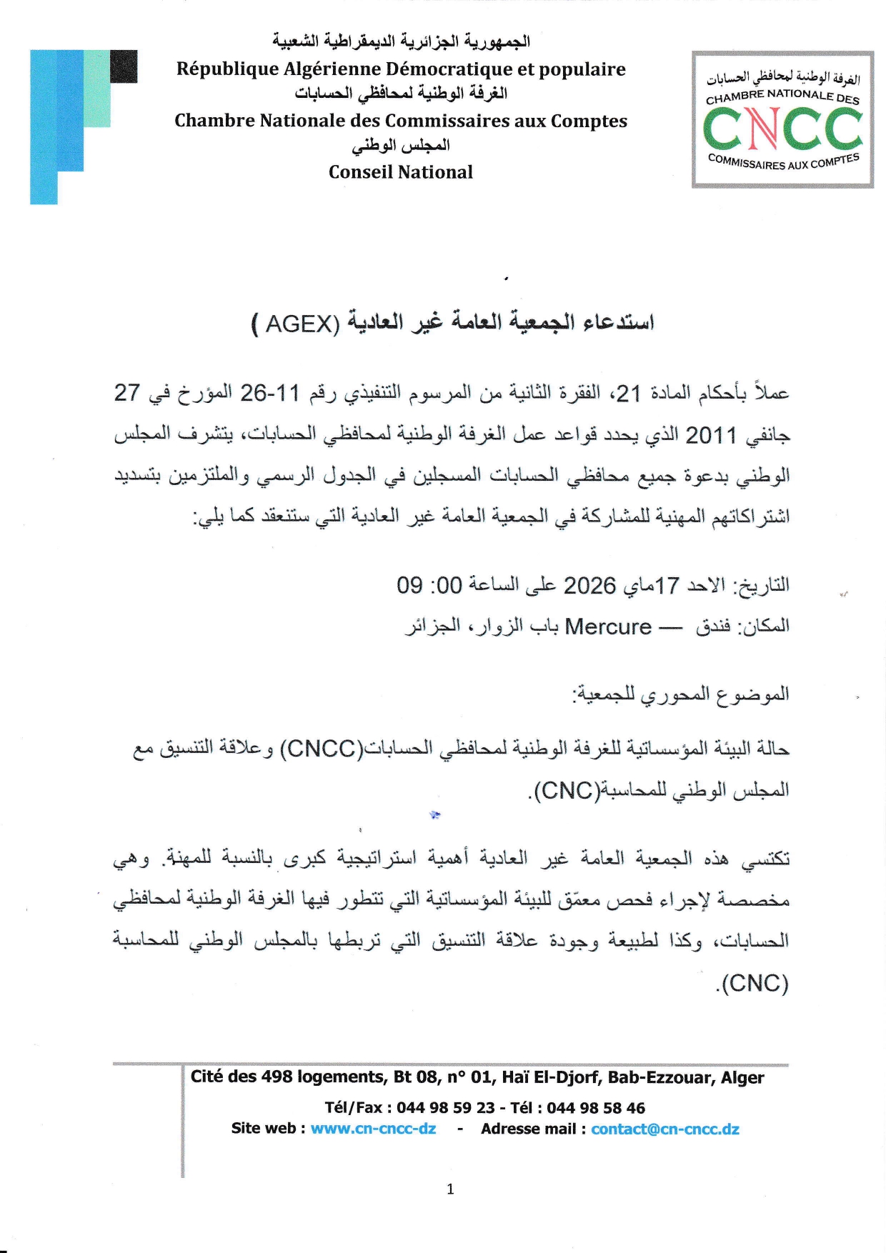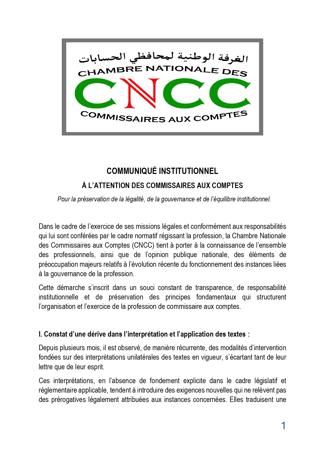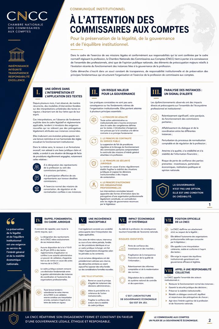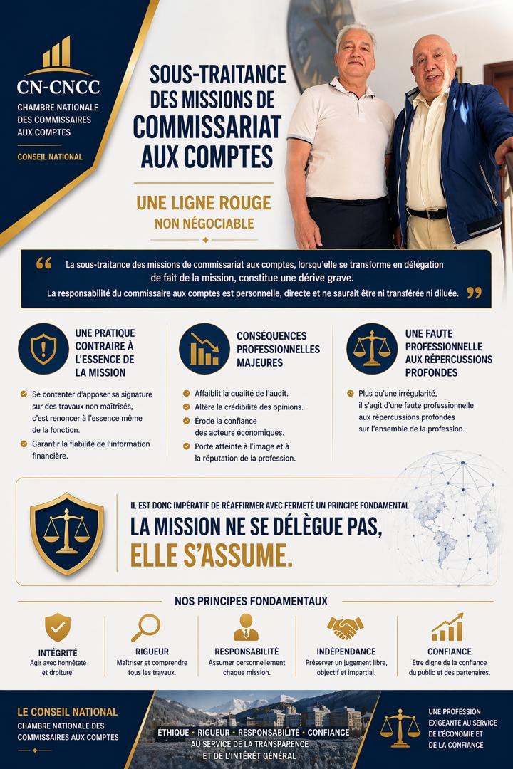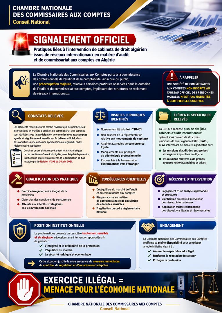 في إطار التزامها بتحديث الإطار التشريعي والتنظيمي للمهنة، نظمت الغرفة الوطنية لمحافظي الحسابات، اليوم، بفندق ماركور ، جلسة تنصيب رسمي لأعضاء فريق العمل المكلف بمراجعة قانون مهنة المحاسبة و التدقيق ، وذلك بحضور نخبة من الخبراء والمهنيين والأساتذة الجامعيين وقد قرر المجلس الوطني للغرفة تعيين السادة والسيدات التالية أسماؤهم لتشكيل هذا الفريق الاستراتيجي 1. السيد يحيـاوي محمد 2. السيد عبـودي محمد 3. السيد بلال بكير 4. السيد ناقة ساسي 5. السيدة رجيمي آسيا 6. السيد بورنان شريف 7. السيد بدالة سعيد 8. السيد ولد طالب صغير 9. السيدة موزاي وسيلة 10. السيد لبيهي مقداد 11. الأستاذ نصر الدين لزّار (محامٍ) 12. الدكتور ميزاني نور الدين (جامعة سكيكدة) 13. السيد جنّان رشيد 14. الدكتور رماح كامل 15. الدكتور قيرة عمر (جامعة جيجل) 16. الأستاذ حمران محمد (المدرسة الوطنية العليا للتسيير) 17. الدكتور بلال عبد الحليم (جامعة سكيكدة) 18. الدكتور ڨريتلي محمد (جامعة البليدة 2 – العفرون) 19. السيدة بوخروبة دنيا 20. السيد دغي مهدي 21. السيد صياد كريم وتأتي هذه المبادرة في إطار الجهود الرامية إلى تطوير قانون المهنة ، بما يتماشى مع التحولات الاقتصادية والالتزامات الدولية للجزائر، وبما يعزز من مكانة محافظ الحسابات كفاعل أساسي في الحوكمة والشفافية المالية