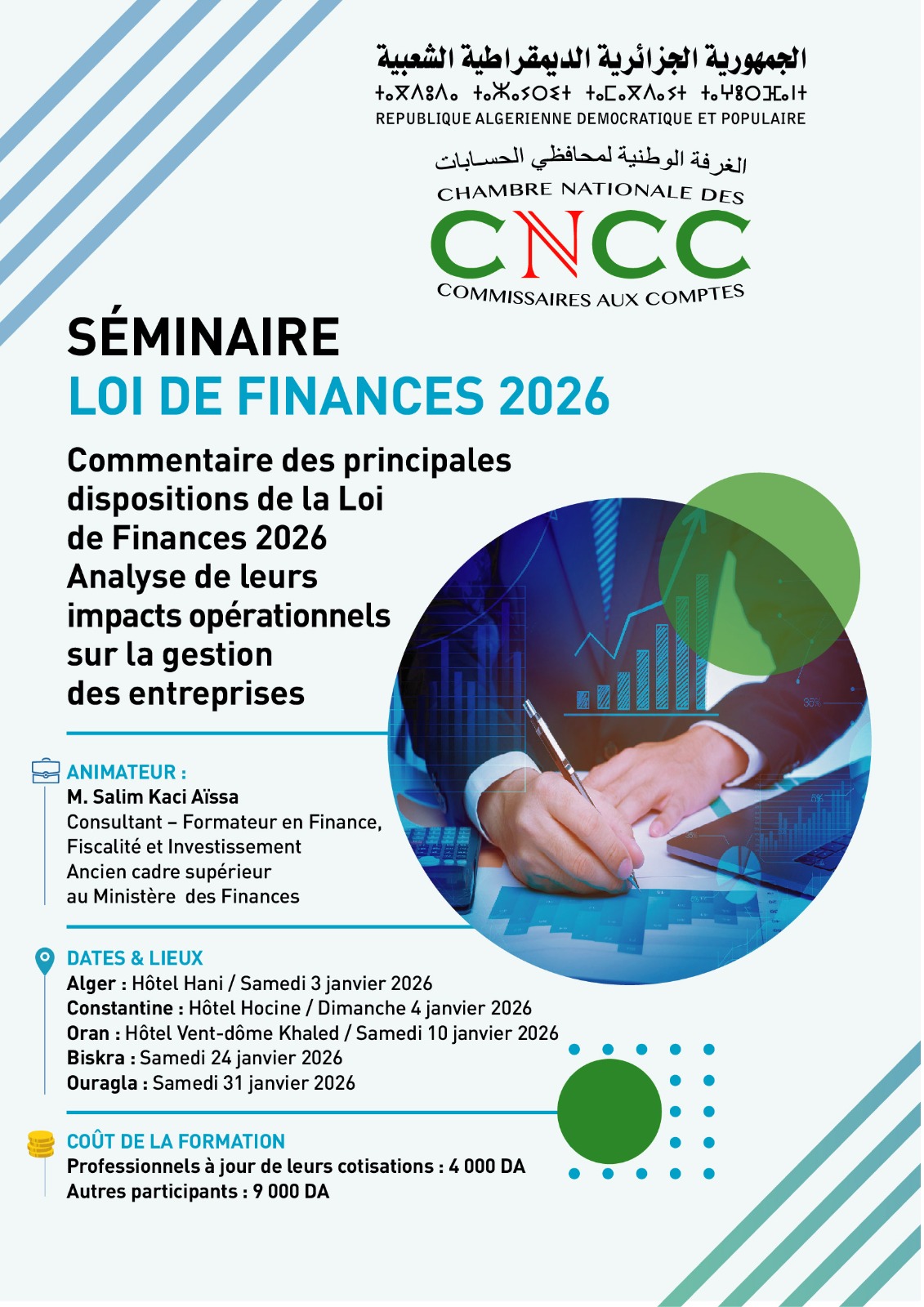 في إطار التزامها بتحديث الإطار التشريعي والتنظيمي للمهنة، نظمت الغرفة الوطنية لمحافظي الحسابات، اليوم، بفندق ماركور ، جلسة تنصيب رسمي لأعضاء فريق العمل المكلف بمراجعة قانون مهنة المحاسبة و التدقيق ، وذلك بحضور نخبة من الخبراء والمهنيين والأساتذة الجامعيين وقد قرر المجلس الوطني للغرفة تعيين السادة والسيدات التالية أسماؤهم لتشكيل هذا الفريق الاستراتيجي 1. السيد يحيـاوي محمد 2. السيد عبـودي محمد 3. السيد بلال بكير 4. السيد ناقة ساسي 5. السيدة رجيمي آسيا 6. السيد بورنان شريف 7. السيد بدالة سعيد 8. السيد ولد طالب صغير 9. السيدة موزاي وسيلة 10. السيد لبيهي مقداد 11. الأستاذ نصر الدين لزّار (محامٍ) 12. الدكتور ميزاني نور الدين (جامعة سكيكدة) 13. السيد جنّان رشيد 14. الدكتور رماح كامل 15. الدكتور قيرة عمر (جامعة جيجل) 16. الأستاذ حمران محمد (المدرسة الوطنية العليا للتسيير) 17. الدكتور بلال عبد الحليم (جامعة سكيكدة) 18. الدكتور ڨريتلي محمد (جامعة البليدة 2 – العفرون) 19. السيدة بوخروبة دنيا 20. السيد دغي مهدي 21. السيد صياد كريم وتأتي هذه المبادرة في إطار الجهود الرامية إلى تطوير قانون المهنة ، بما يتماشى مع التحولات الاقتصادية والالتزامات الدولية للجزائر، وبما يعزز من مكانة محافظ الحسابات كفاعل أساسي في الحوكمة والشفافية المالية