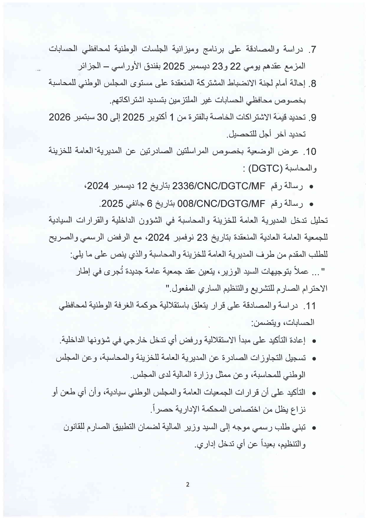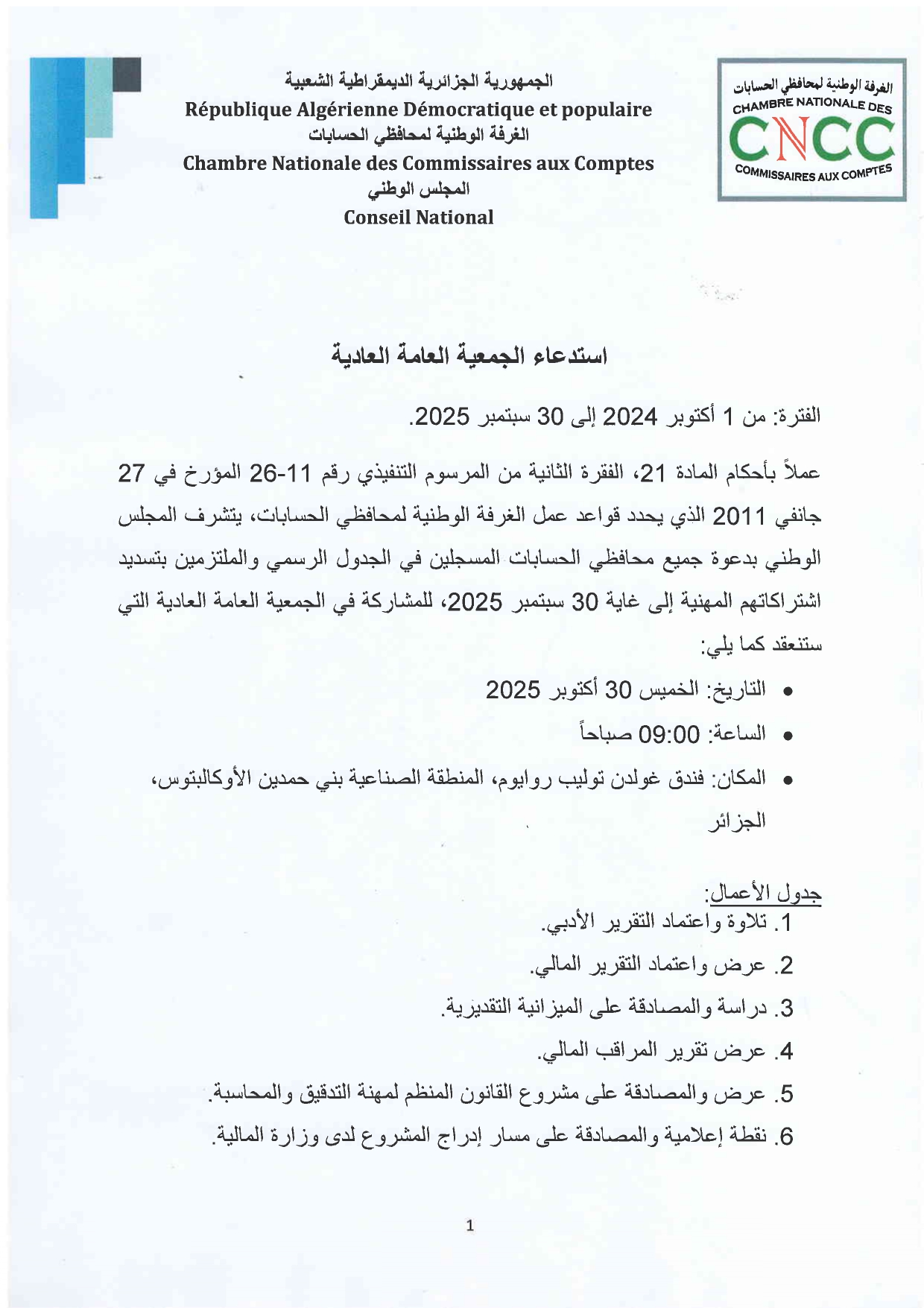 الخطاب الرسمي – الجمعية العامة العادية لمحافظي الحسابات. الجزائر، 30 أكتوبر 2025