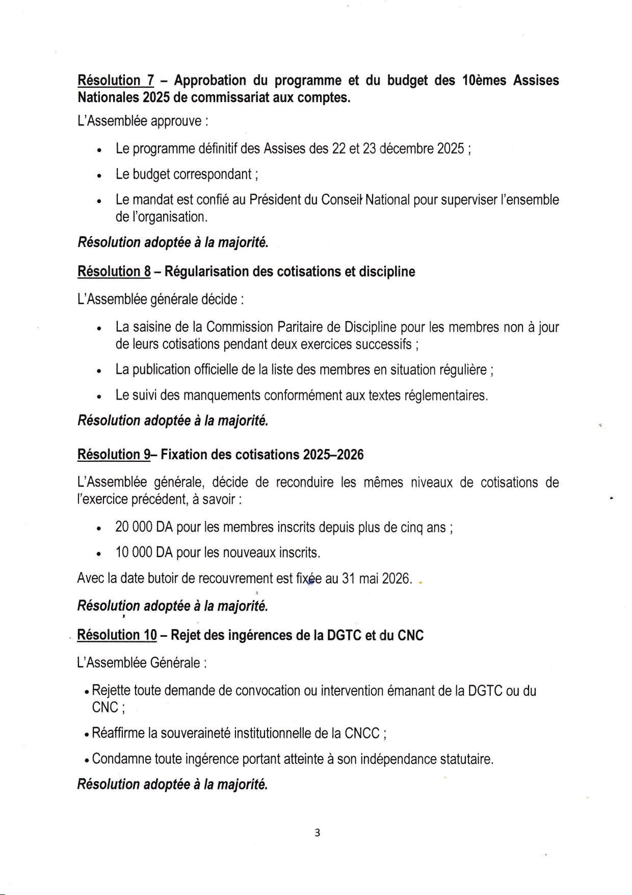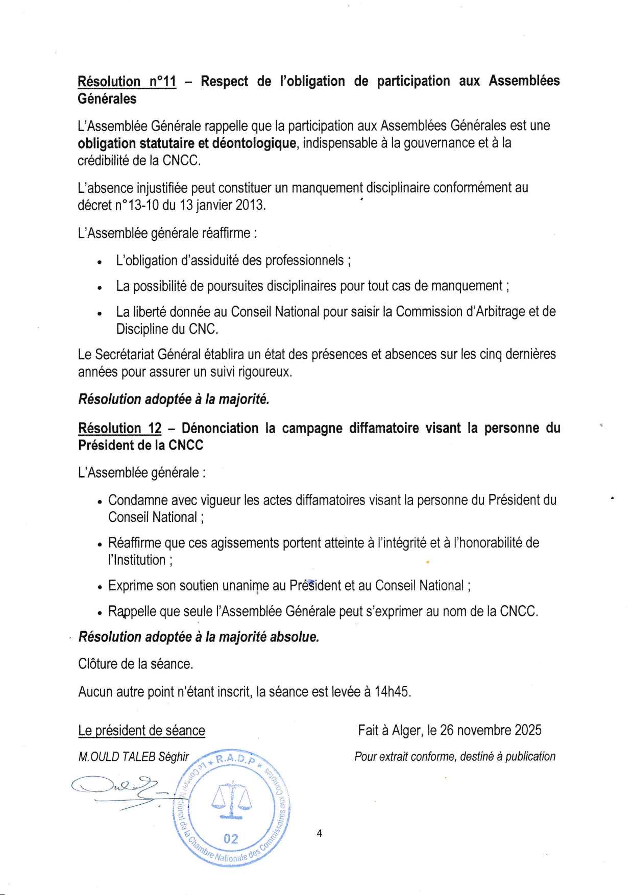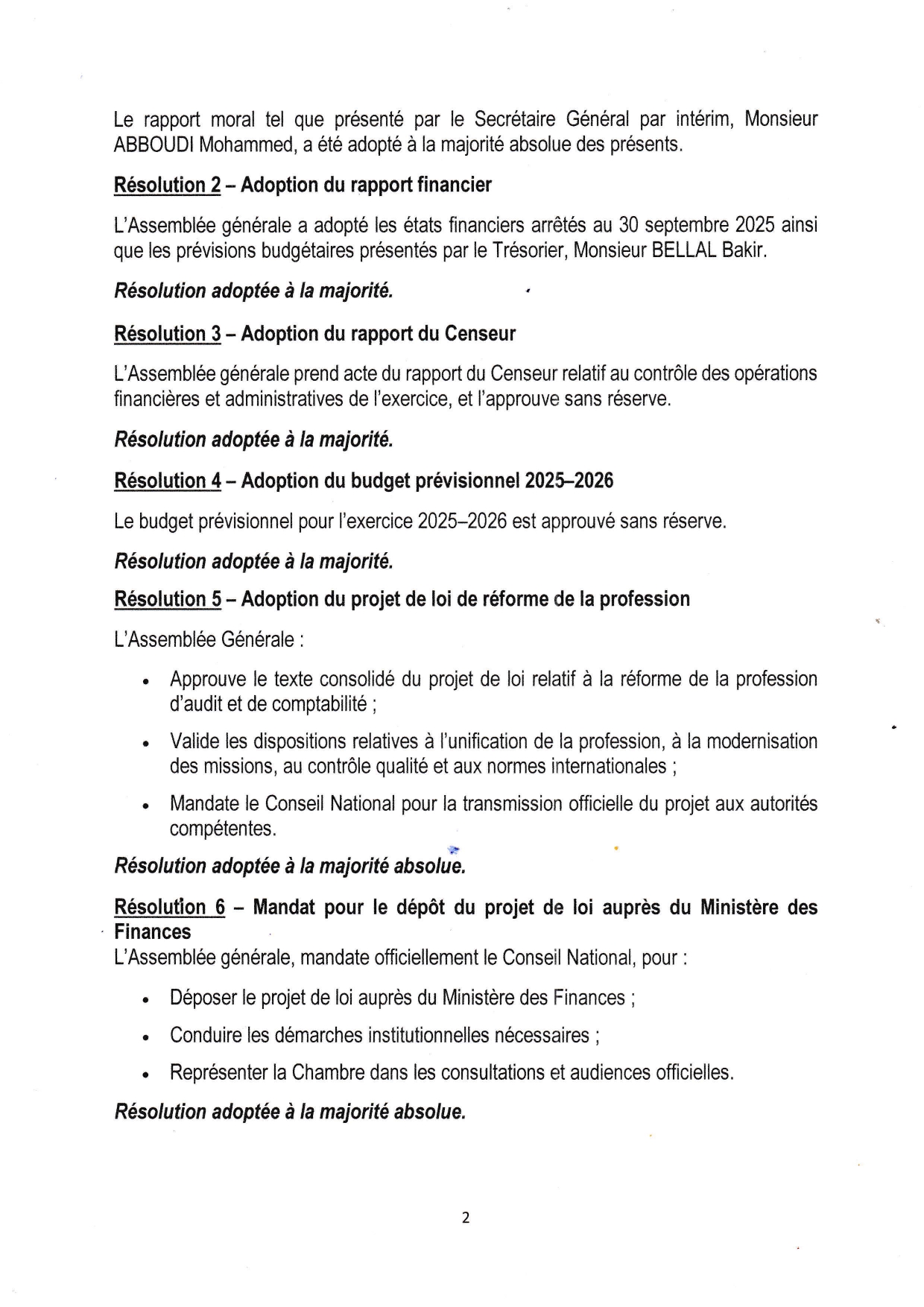 EXTRAIT DU PROCÈS-VERBAL DU BUREAU DE L'ASSEMBLÉE GÉNÉRALE ORDINAIRE DE LA CHAMBRE NATIONALE DES COMMISSAIRES AUX COMPTES DU 26 NOVEMBRE 2025