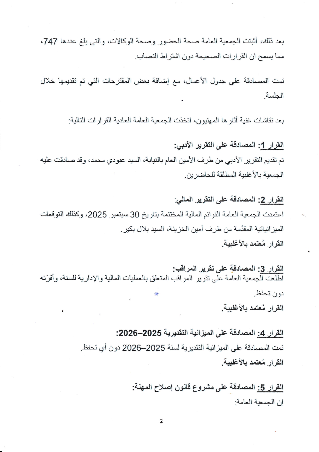 محضر مقتطف من جلسة مكتب الجمعية العامة العادية للغرفة الوطنية لمحافظي الحسابات المنعقدة بتاريخ 26 نوفمبر 2025