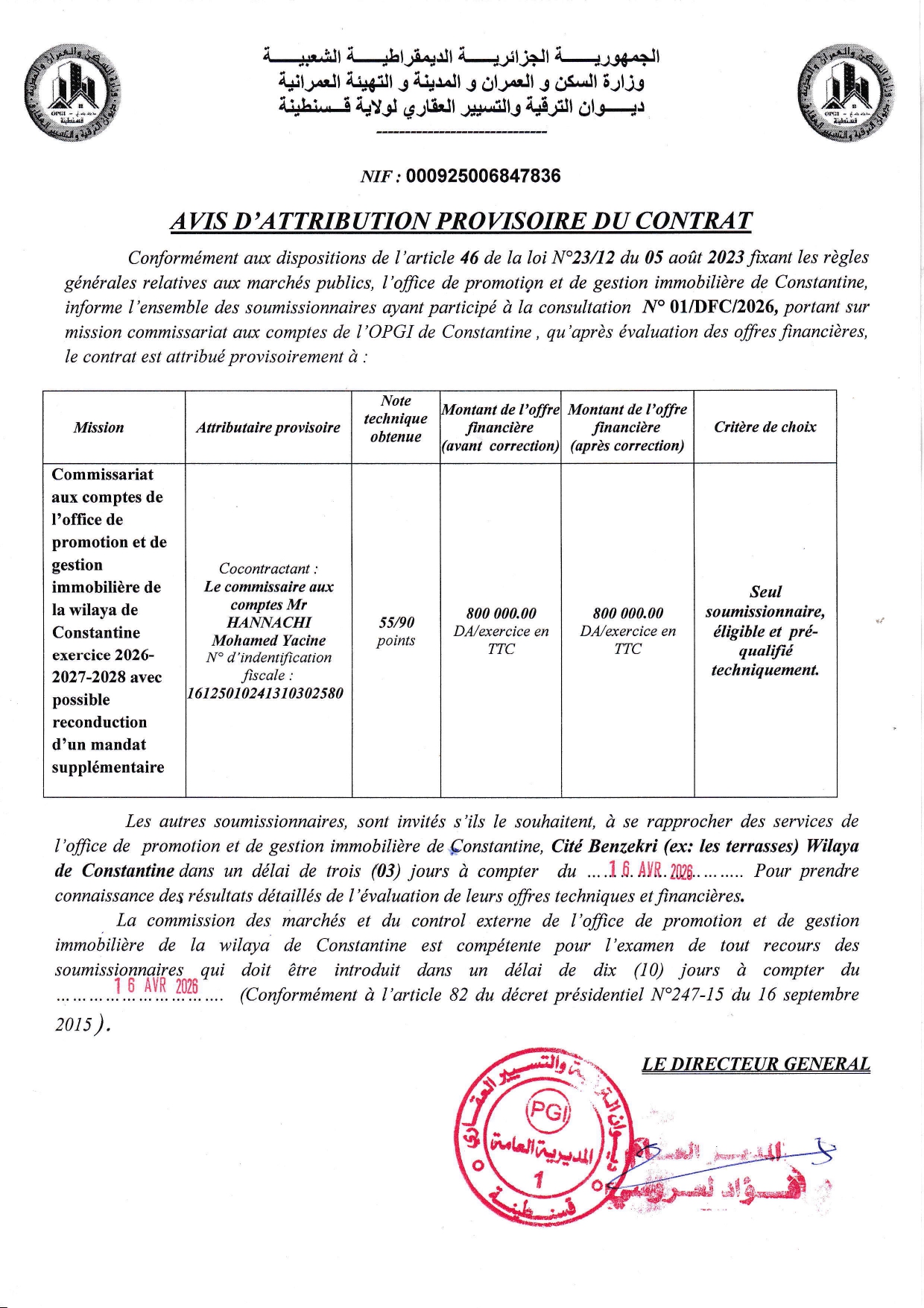 Avis d'attribution provisoire: consultation N° 01/DFC/2026 portant sur mission commissariat aux comptes de l' OPGI de Constantine